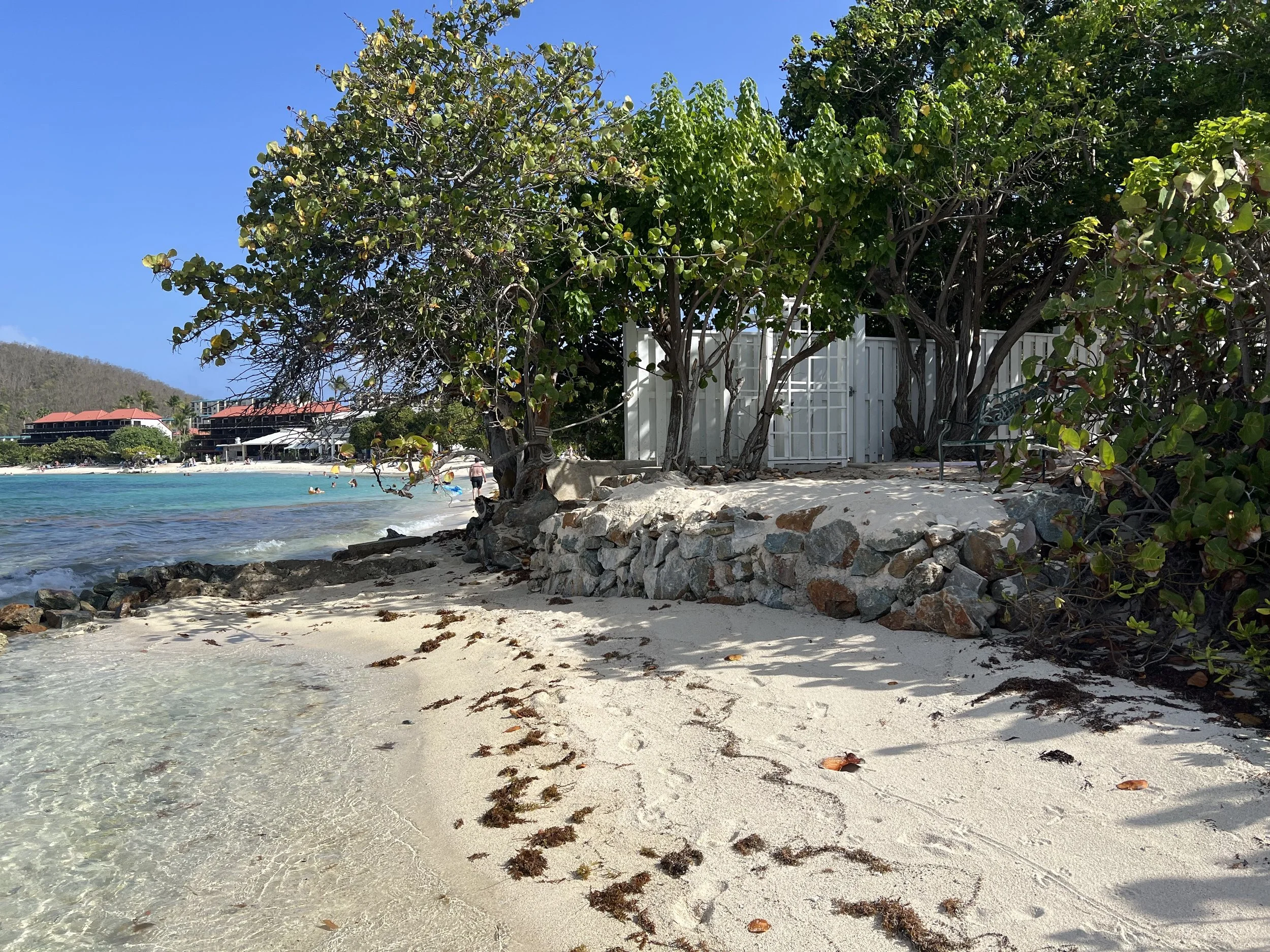 While Sapphire Beach is just steps away, the villa is very secure. A gated fence is your access to the main beach. This is the beach directly in front of the Villa. Seagrapes and reef make the Villa very private yet steps away from the main beach.